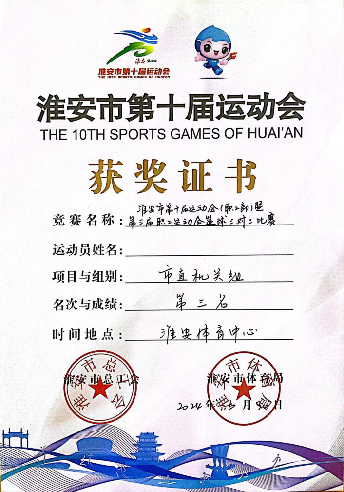 6月30日,從市第三屆職工運(yùn)動(dòng)會(huì)組委會(huì)傳來喜訊,由領(lǐng)隊(duì)田庚,運(yùn)動(dòng)員黃忠、孫逸人、余樂、許建、李文杰組成的淮安法院籃球參賽代表隊(duì)力克強(qiáng)手,一路過關(guān)斬將,在20支參賽隊(duì)伍中勇奪第三名!