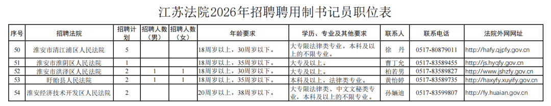 根據工作需要,江蘇法院面向社會公開招聘聘用制書記員202名。其中,淮安法院5家基層法院面向社會公開招聘。現將有關事項公告如下:
