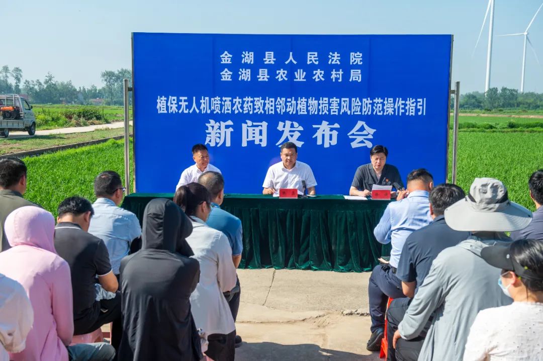 為深入貫徹落實(shí)中央農(nóng)村工作會(huì)議精神,因地制宜護(hù)航我縣農(nóng)業(yè)新質(zhì)生產(chǎn)力發(fā)展。7月4日上午,金湖法院聯(lián)合縣農(nóng)業(yè)農(nóng)村局在金南鎮(zhèn)福壽村召開新聞發(fā)布會(huì),并正式發(fā)布實(shí)施《金湖縣植保無人機(jī)噴灑農(nóng)藥致相鄰動(dòng)植物損害風(fēng)險(xiǎn)防范操作指引》(下稱《操作指引》)。金湖縣政府副縣長、黨組成員張鑫,縣法院黨組書記、院長徐俊,縣農(nóng)業(yè)農(nóng)村局黨委書記、局長嵇成明出席會(huì)議。部分市縣人大代表、政協(xié)委員,各鎮(zhèn)政府(街道)和農(nóng)場分管負(fù)責(zé)同志,植保機(jī)經(jīng)銷商、飛手代表以及多家新聞媒體受邀參會(huì)。