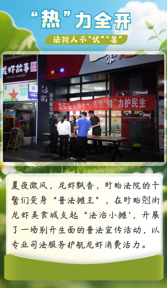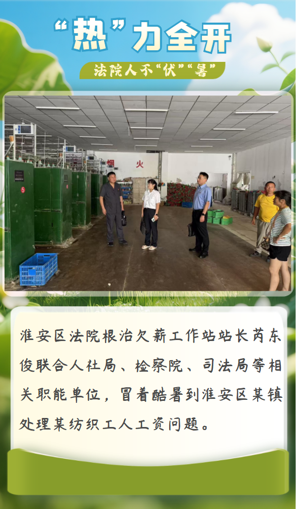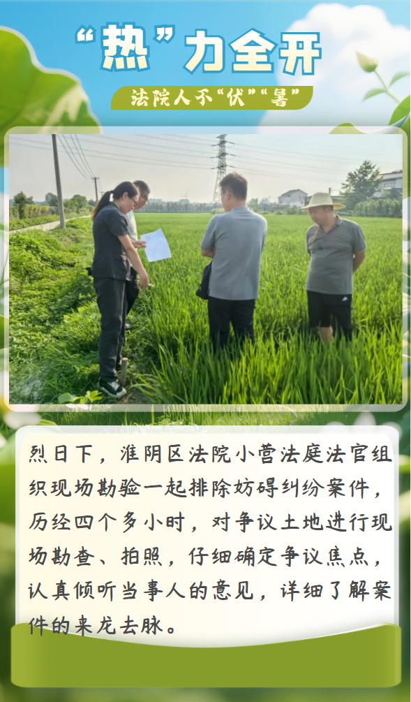 大暑為二十四節氣中的第十二個節氣,是夏季最后一個節氣。正值一年中最熱的時段,恰是農作物奮力生長的好時節。酷暑不僅是自然界的考驗,更是對為民司法初心的淬煉。淮安中院人亦是如此無懼火熱“烤”驗,堅守崗位不“伏”“暑”!