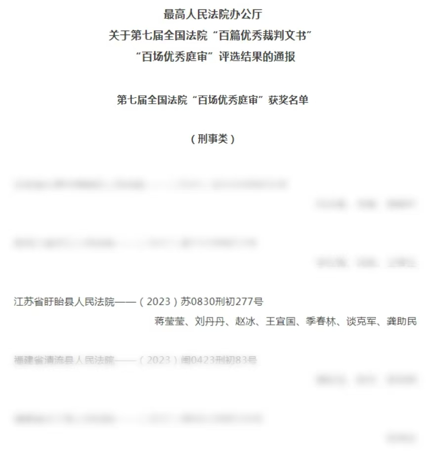 近日,最高人民法院對第七屆全國法院“百篇優(yōu)秀裁判文書”“百場優(yōu)秀庭審”評選獲獎結(jié)果進(jìn)行通報。其中,由我市盱眙縣人民法院蔣瑩瑩、劉丹丹、趙冰、王宜國、季春林、談克軍、龔助民組成合議庭審理的(2023)蘇0830刑初277號刑事案件榮獲全國法院“百場優(yōu)秀庭審”,全省僅三家!